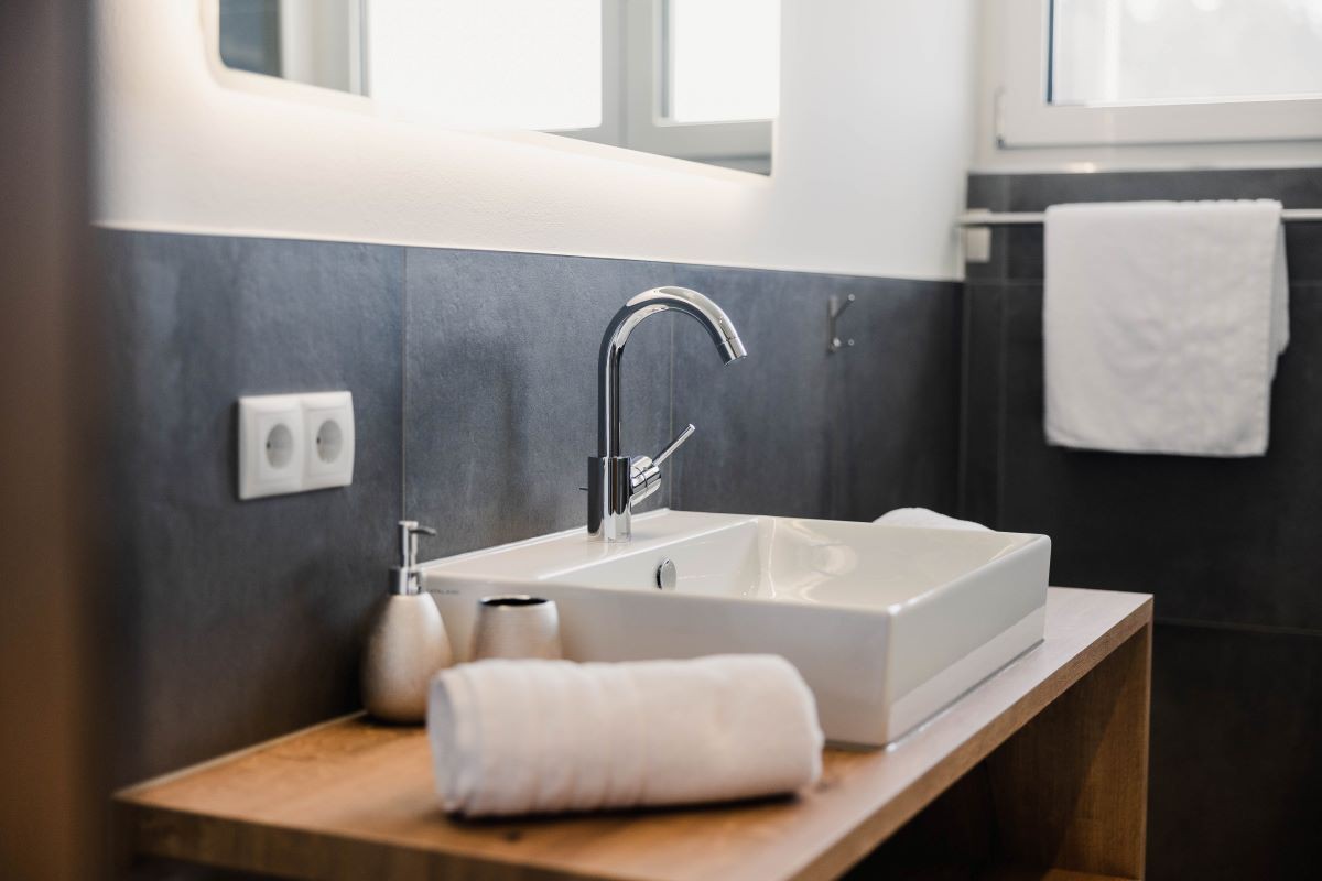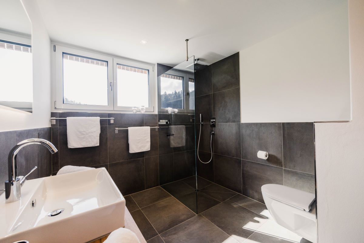 Das moderne Badezimmer überzeugt mit zeitgemäßer Ausstattung und angenehmem Komfort.